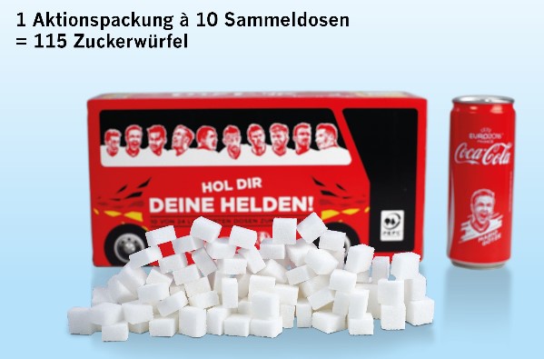 In einem Schreiben an foodwatch rechtfertigt der DFB die Partnerschaft mit Coca-Cola: Für die Zunahme des Übergewichts bei Kindern sei „nicht die Bevorzugung von süßen oder salzigen Lebensmitteln und Getränken“ verantwortlich. Obwohl zahlreiche einschlägige Studien belegen, dass Zuckergetränke Übergewicht, Fettleibigkeit und Diabetes Typ II fördern. Experten sprechen von einer „Adipositas-Epidemie“ – gerade auch wegen des übermäßigen Zucker-Konsums von jungen Menschen. Kinder und Jugendliche zwischen drei und 17 Jahren trinken durchschnittlich mehr als zwei Gläser zuckerhaltige Getränke pro Tag. Unter den 14- bis 17-Jährigen sind es sogar drei bis vier Gläser. Den alarmierenden Fakten zum Trotz lässt der DFB seit rund einem Monat die Gesichter der 24 Nationalspieler auf Cola-Dosen drucken, eine begleitende Plakatkampagne startet in dieser Woche. In 24 Dosen stecken insgesamt 280 Zuckerwürfel (oder 840 Gramm Zucker).