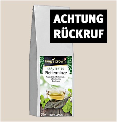 Rossmann bittet darum, alle Packungen des King’s Crown Kräutertees Pfefferminze mit den Chargen L-Nr. 4516-02578, L-Nr. 5016-02578 und L-Nr. 0317-03675 nicht mehr zu verwenden und in eine der Verkaufsstellen zurückzubringen. Die Charge ist auf der Rückseite des Artikels vermerkt.