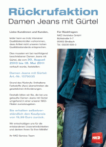 NKD hat daraufhin umgehend reagiert und bittet betroffene Verbraucher, die gekaufte Damen Jeans mit Gürtel umgehend in einer NKD-Filiale zurückzugeben. Der Kaufpreis von 19,99 Euro wird ihnen selbstverständlich erstattet