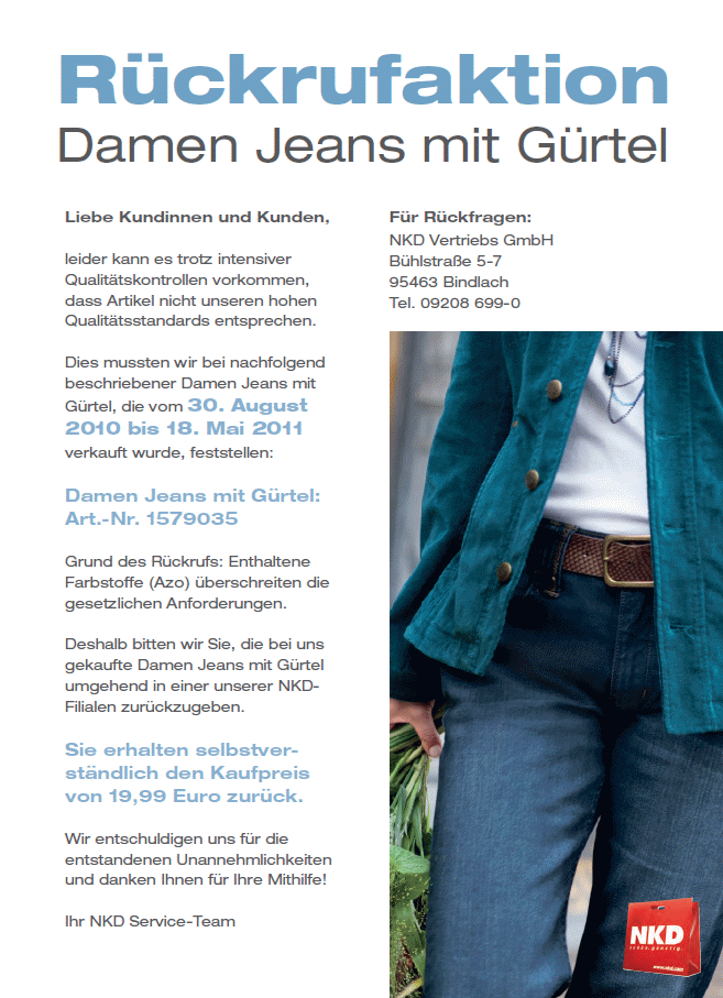 Die NKD-Vertriebs GmbH hat uns soeben über einen Rückruf von Damen Jeans mit Gürtel informiert. Wie das Unternehmen mit Sitz in Bindlach weiter mitteilt, enthalten die betroffenen Artikel sog. Azofarbstoffe die die gesetzlichen Grenzwerte übersteigen. Azofarbstoffe gelten als krebserzeugend, erbgutverändernd und möglicherweise fruchtschädigend.