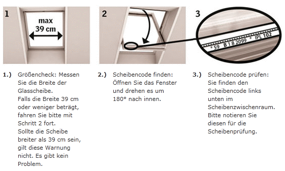 Um zu prüfen, ob in Ihrem Dachfenster eine von dieser Produktwarnung betroffene Scheibe verbaut ist, gehen Sie bitte wie folgt vor:
