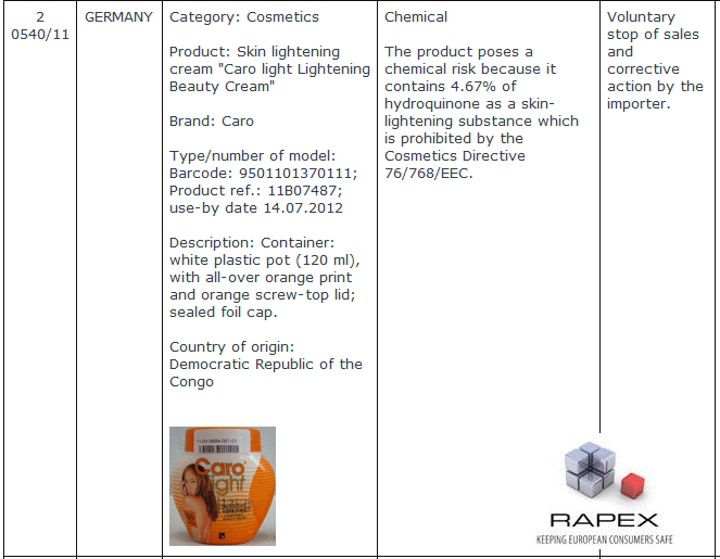 Wie in der RAPEX-Wochenmeldung vom 17.06.2011 berichtet, enthält diese aufhellende Hautcreme Hydrochinon. Hydrochinon ist toxisch, schleimhautreizend und steht auch in Verdacht krebserzeugend zu sein. Verbraucher sollten grundsätzlich auf Wunderpillen und Cremes aus dem Internet oder einschlägigen Shops verzichten, oder zumindest vor der ersten Anwendung Rücksprache mit ihrem Arzt halten.