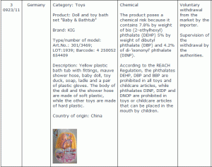 Bei diesem Puppen-und Spielzeug Badeset „Baby & Bathtub“ von KIG besteht ein chemisches Risiko durch verbotene Weichmacher. Bestimmte Weichmacher auf Basis von Phthalaten können Unfruchtbarkeit bei Männern verursachen, da sie in ihrer Wirkung bestimmten Hormonen ähnlich sind. Sie beeinflussen die Testosteron-gesteuerten Entwicklungsstufen. Beim Kauf solcher Produkte sollte unbedingt auf den Hinweis „frei von Weichmachern/Phthalaten“ geachtet werden.