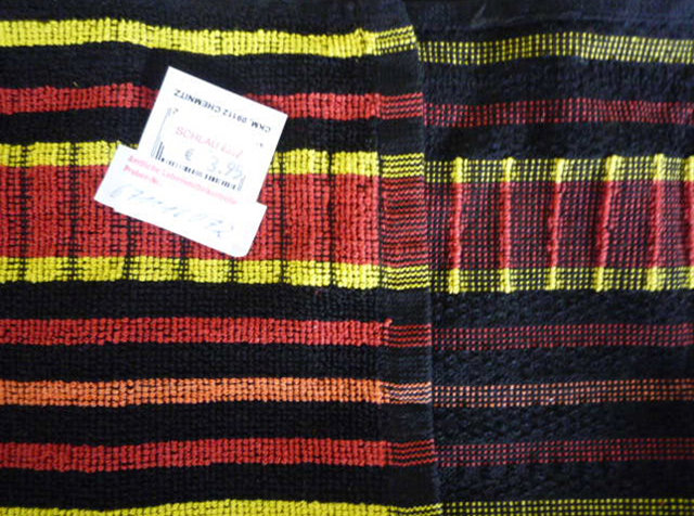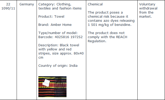 In diesem Handtuch findet sich Benzidin in nicht unerheblicher Konzentration. Der Import und Vertrieb von Bedarfsgegenständen, die die festgelegten Grenzwerte überschreiten, ist in der EU verboten.