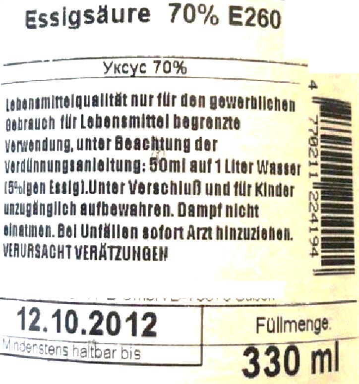 Das aus Litauen nach Deutschland importierte und überwiegend an russische Einzelhandelsgeschäfte gelieferte Mittel stand im Verkaufsregal zudem oft bei herkömmlichem Essig. Wird das konzentrierte Produkt versehentlich verschluckt, bestehen erhebliche Gefahren durch Verätzungen. Der Flaschenverschluss hat zudem keine Kindersicherung oder eine andere geeignete Schutzvorrichtung.