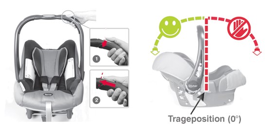 Wie Britax-Römer mitteilt sind einige Fälle bekannt geworden, in welchen eine Falschbedienung der Tragebügel entgegen der Gebrauchsanweisung zur kompletten Ablösung des Tragebügels geführt hat.