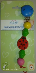 (ck) – Ökotest hat für die Januarausgabe 2012 Schnullerketten getestet. Bei der Beauty Baby Holzschnullerkette Marienkäfer von Müller lösten sich beim Test durch Reißen des Bandes die aufgefädelten Holzperlen. Diese losen Perlen können, sofern diese vom Baby verschluckt werden eine ernsthafte Gefahr darstellen.