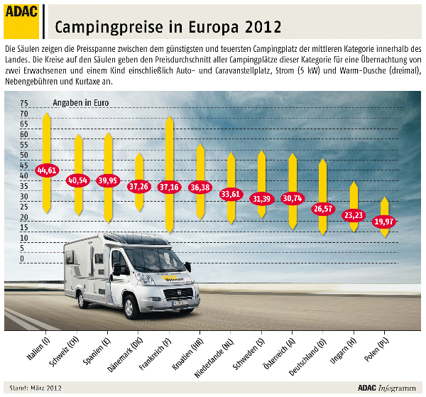 Europas Campingplätze starten nach Angaben des ADAC mit Preiserhöhungen von durchschnittlich drei Prozent in die Saison 2012. Damit fällt der diesjährige Preisanstieg etwas höher aus als im Vorjahr (2,5 Prozent), aber immer noch geringer als in den letzten Jahren. 34,30 Euro müssen zwei Erwachsene mit einem 10-jährigen Kind in der Hauptsaison 2012 durchschnittlich für eine Übernachtung auf einem europäischen Campingplatz bezahlen. In diesem Preis enthalten sind Auto- und Caravanstandplatz, Nebengebühren, Strom und Warmduschen sowie Kurtaxe.
