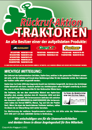 Der Getriebehersteller Hydro-Gear teilt mit, daß in einem bestimmten Zeitraum fehlerhafte Getriebe für Kleintraktoren ausgeliefert worden sind. Bei den betroffenen Getrieben kann das Antriebsrad ausfallen wodurch nur eine eingeschränkte Bremswirkung gegeben ist. Dadurch besteht Verletzungsgefahr für den Anwender.