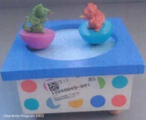 | Beschreibung: | Kunststoff Spieluhr in der Form eines Drachen, blau mit bunten Punkten, vier Füßen, und ein Aufzugs-Mechanismus mit zwei Drachen-Figuren auf der Spitze aus Kunststoff |