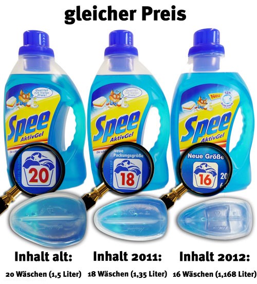 Verpackungen, auf den ersten Blick kaum oder gar nicht erkennbar verändert oder sogar scheinbar größer, und eine „neue Rezeptur“ sind die Tricks, mit denen Unternehmen versuchen, die Preiserhöhung zu verschleiern. Gerade sind es insbesondere Waschmittel oder Waschzusätze, über die uns Verbraucherbeschwerden erreichen.
