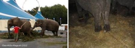 Bild 1: Mit Schlägen zurückgedrängt: Elefantendame Maschibi bei Circus Carl Busch, August 2012 Bild 2: Verboten: Elefant bei Carl Busch an blanker Kette, März 2012 © PETA