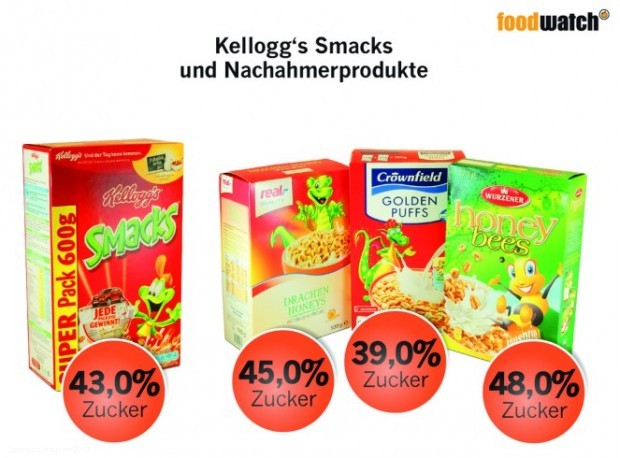 Frühstücksflocken, die für Kinder vermarktet werden, sind fast ausnahmslos überzuckert und erfüllen nicht die Ansprüche an ein kindgerechtes Frühstück. Das zeigt ein Marktcheck von foodwatch. Die Verbraucherorganisation hat 143 Produkte unter die Lupe genommen, die in Aufmachung und Werbung gezielt Kinder ansprechen. Ergebnis: In jeder zweiten Packung stecken mindestens 30 Prozent Zucker. 4 von 5 Produkten haben einen Zuckergehalt von mehr als 20 Prozent. Nicht einmal 6 Prozent der untersuchten Produkte weisen einen Zuckergehalt von unter 10 Prozent auf. Die beliebten Smacks von Kellogg’s zum Beispiel enthalten 43 Gramm Zucker.