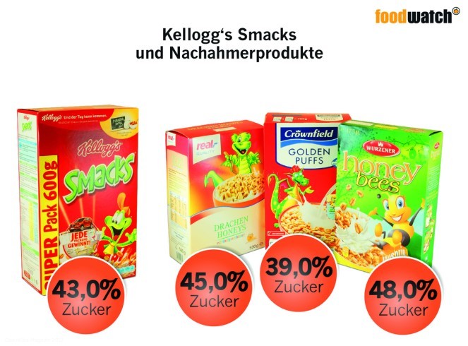 foodwatch fordert deshalb klare gesetzliche Mindestanforderungen für Kinder-Frühstücksflocken: Nur noch solche Produkte, die maximal 10 Prozent Zucker enthalten, dürfen an Kinder vermarktet werden. „Eine Zuckergrenze muss gesetzlich festgelegt werden – denn von sich aus werden die Hersteller nicht aufhören, Kinder mit Zuckerbomben zu ködern“, so Oliver Huizinga. „Im Gegenteil: Nestlé-Chef Gerhard Berssenbrügge zum Beispiel behauptet auch noch dreist, die Frühstücksflocken seien ,keine Süßigkeiten, sondern ein vollwertiger Start in den Tag‘.“ Neben der ,Droge Zucker‘ setzen die Hersteller auf Comicfiguren, Gewinnspiele und Spielzeugbeigaben, um die Kinder zu locken – und auf zugesetzte Vitamine und Vollkorngetreide, um den Eltern ein gutes Gefühl zu geben.
