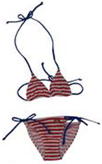 | Beschreibung: | Bikini mit rosa Streifen und grünen Schnüren oder mit roten Streifen und blauen Schnüren. Bikini kann mit elastischen Schnüren am Hals und auf der Rückseite und an der Seite des Slips gebunden werden |
