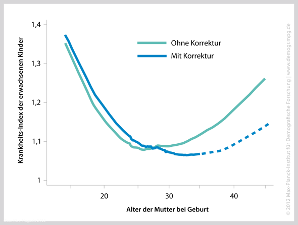Der MPIDR-Forscher kam zu diesen Ergebnissen, indem er die Gesundheitsdaten der Amerikaner um die tatsächlichen Einflüsse bereinigte, die einen negativen Effekt des fortgeschrittenen Mütteralters vorgaukeln – nämlich Bildungsstand und Lebensspanne der Mutter. Rechnete er diese Faktoren nicht heraus, waren die erwachsenen Kinder wirklich kränker, wenn die Frauen später Mutter wurden: Der Nachwuchs von 35- bis 44-Jährigen schien dann über zehn Prozent mehr Krankheiten zu bekommen als der von 25- bis 34-Jährigen.