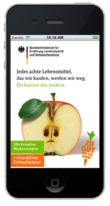 Im Rahmen der Initiative Zu gut für die Tonne, die am Montagabend in Berlin mit dem „Politikaward 2012“ ausgezeichnet worden ist, hat das Ministerium die besten Tipps und Reste-Rezepte in einer App für Smartphone-Nutzer gesammelt. Bei der Vorstellung der App am Dienstag im „Kochhaus“ in Berlin sagte Bundesverbraucherministerin Ilse Aigner: „Lebensmittelreste lassen sich in der Küche nicht immer vermeiden. Mit etwas Phantasie und Freude am Kochen kann aber aus Resten etwas Leckeres gezaubert werden. Mit unserer neuen App „Zu gut für die Tonne“ können sich Verbraucher interessante Tipps holen. Die App ist ein praktischer Helfer für die Küche und den nächsten Einkauf. Wer Reste vermeiden will, sollte vor allem die richtige Lagerung der Lebensmittel beachten und seine Einkäufe gut planen.“
