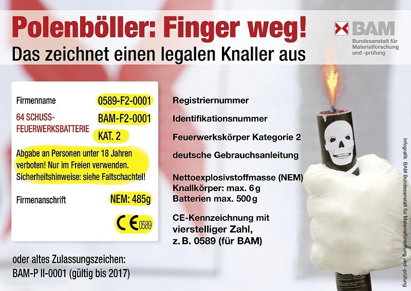 Zu finden ist auch eine BAM-Identifikationsnummer, zum Beispiel „BAM-F2-0001“. In Deutschland verkaufte Produkte müssen eine Identifikationsnummer mit diesem BAM-Hinweis haben (die BAM-ID-Nummer).