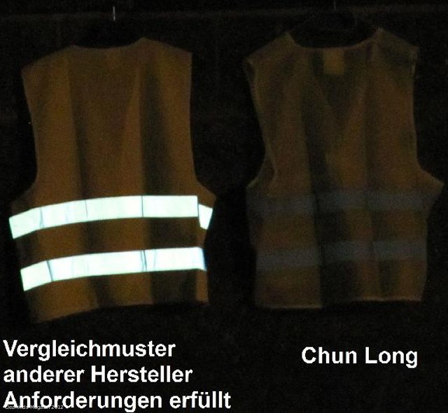 Die hier gemeldete Warnweste entspricht nicht der Richtlinie für persönliche Schutzausrüstung (PSA), da die Reflektoren nicht ausreichend reflektierend sind und daher nicht die Sicherheit des Benutzers in der Dunkelheit sicherstellen. In Folge kann es zu Verletzungen kommen, denn der Nutzer ist in dem Glauben, rechtzeitig gesehen zu werden.