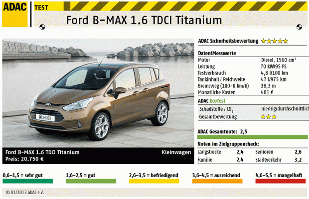 Darüber hinaus überzeugt der Ford B-Max als solides und gelungenes Fahrzeug mit großem Raumangebot und richtig guter Sicherheitsausstattung – insbesondere beim passiven Insassenschutz. Nur bei der Rundumsicht schneidet er weniger gut ab, zu breit sind die hinteren Dachsäulen. Trotzdem waren die Tester mit dem kleinen Kölner gern unterwegs, denn das Fünf-Gang-Getriebe lässt sich gut schalten und das Fahrwerk ist komfortabel ausgelegt. Während der Fahrt ist der B-Max innen angenehm leise. Dank niedrigem Verbrauch fällt die Reichweite groß aus. Im ADAC Ecotest erzielt das Fahrzeug drei von fünf Sternen – für ein besseres Ergebnis müssten die Schadstoffwerte geringer ausfallen.