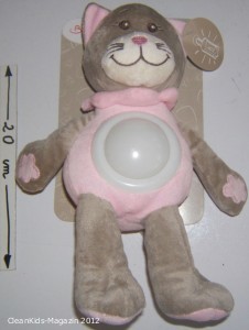 Dieses Stofftier von Bengy mit Nachtlicht „Katze Marianne“ birgt gleich mehrere Gefahren für Kleinkinder. Erstickungsgefahr durch ablösbare Kleinteile und Verletzungsgefahr durch scharfkantige Elemente. Die melden französische Behörden an das europäische Schnellwarnsystem Rapex. Die Meldung hat eine Vernichtung der Restbestände zur Folge.