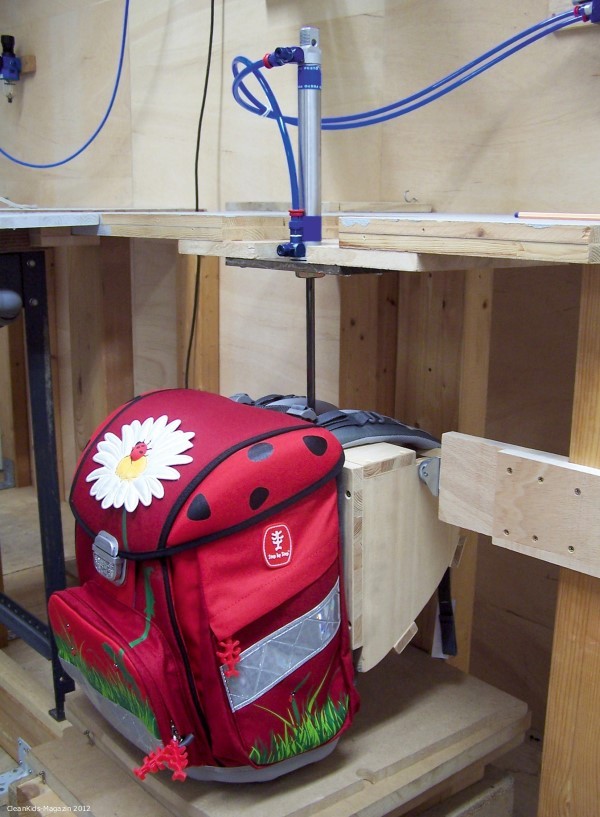 Eine spezielle Vorrichtung im Prüflabor stauchte die beladenen Ranzen, wie es im Alltag ständig geschieht. Dazu wurden sie tausendmal zehn Zentimeter angehoben und fallen gelassen – Foto: ÖKO-TEST