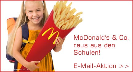 Gleichzeitig begibt sich der Staat in die Abhängigkeit der Konzerne, wenn er hoheitliche Aufgaben wie die Bildung in staatlichen Schulen finanzieren lässt von McDonald’s und anderen. foodwatch hat die Bundesregierung und die Stiftung Verbraucherschutz als Träger des Bündnisses aufgefordert, Unternehmen und Wirtschaftsverbände auszuschließen: Edeka, McDonald’s & Co. haben in den Schulen nichts verloren!