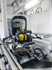 Im Prüflabor: Auf dem Rollenprüfstand legten die Kinderwagen eine Strecke von circa 30 Kilometer über rotierende Walzen zurück. Unterschiedlich hohe Stoßleisten simulierten das Fahren auf verschiedenen Untergründen wie Schotter oder Kopfsteinpflaster. Foto: velotech.de