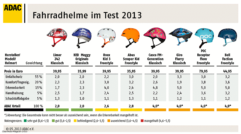 Die Spitzenplätze mit der Note „gut“ belegen zwar die klassischen Helme Limar 242 und KED Meggy Originals, aber auf Platz 3 und 4 folgen mit einem „befriedigend“ gleich zwei Freestyle-Produkte: Der Kid 3 von UVEX und der Abus Scraper Kid.