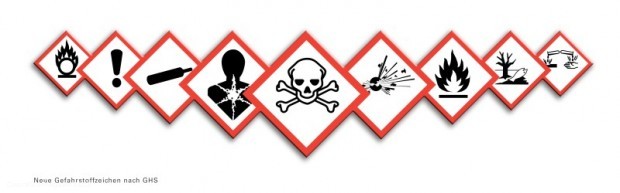 Endverbraucher werden künftig immer öfter neue Gefahrstoffzeichen – Symbole auf weißem Hintergrund mit rotem Rahmen – auf ihren Produkten finden. Sie werden nach und nach die bekannten orangefarbenen Quadrate ersetzen. Hintergrund für diese Veränderung ist die EU-Verordnung zur Einstufung, Kennzeichnung und Verpackung von reinen Chemikalien, die mit unterschiedlichen Übergangsfristen für alle Substanzen bis Mitte 2015 umgesetzt werden muss.
