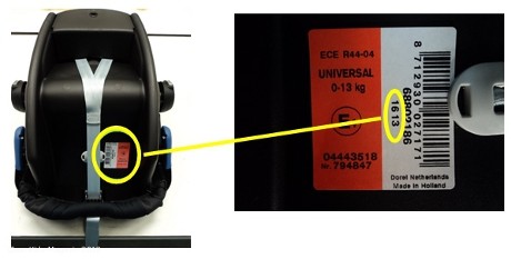 In diesem Beispiel bezieht sich die Nummer 1613 auf das Herstellungsdatum. In diesem Beispiel steht sie für KW 16 des Jahres 2013. Wenn das Etikett auf Ihrem Citi SPS mit einer Nummer zwischen 2312 und 5212 oder 0113 und 2213 versehen ist, wird dringend angeraten, das Gurtschloss auszutauschen.