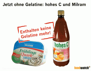 Der Milram „Frühlingsquark leicht“ enthält keine Gelatine mehr als Verdickungsmittel; auf der Verpackung ist der Hinweis „ohne Zusatz von Gelatine“ aufgedruckt