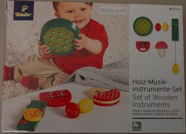 Bei diesem Musikinstrumente-Set aus Holz von Tchibo besteht nicht nur Erstickungsgefahr durch verschluckbare Kleinteile, sondern auch Verletzungsgefahr durch hervorstehende Holzstäbchen.