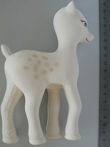 | Beschreibung: | Spielzeug in Form von einem Reh aus weichem, weißen, elastischen Material. Der Kopf ist schwarz, weiß und rot, die Ohren sind rosa und die Rückseite hat hellbraune Flecken. Das Spielzeug ist ca. 15 cm in der Höhe mit einer Körperlänge von ca. 8 cm. Es wird in einem Karton geliefert. |