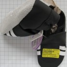 | Beschreibung: | Baby-Schuhe. Obermaterial und Futter in schwarzem Leder, Hellgraue Ledersohle und zwei weiße Streifenapplikationen |
