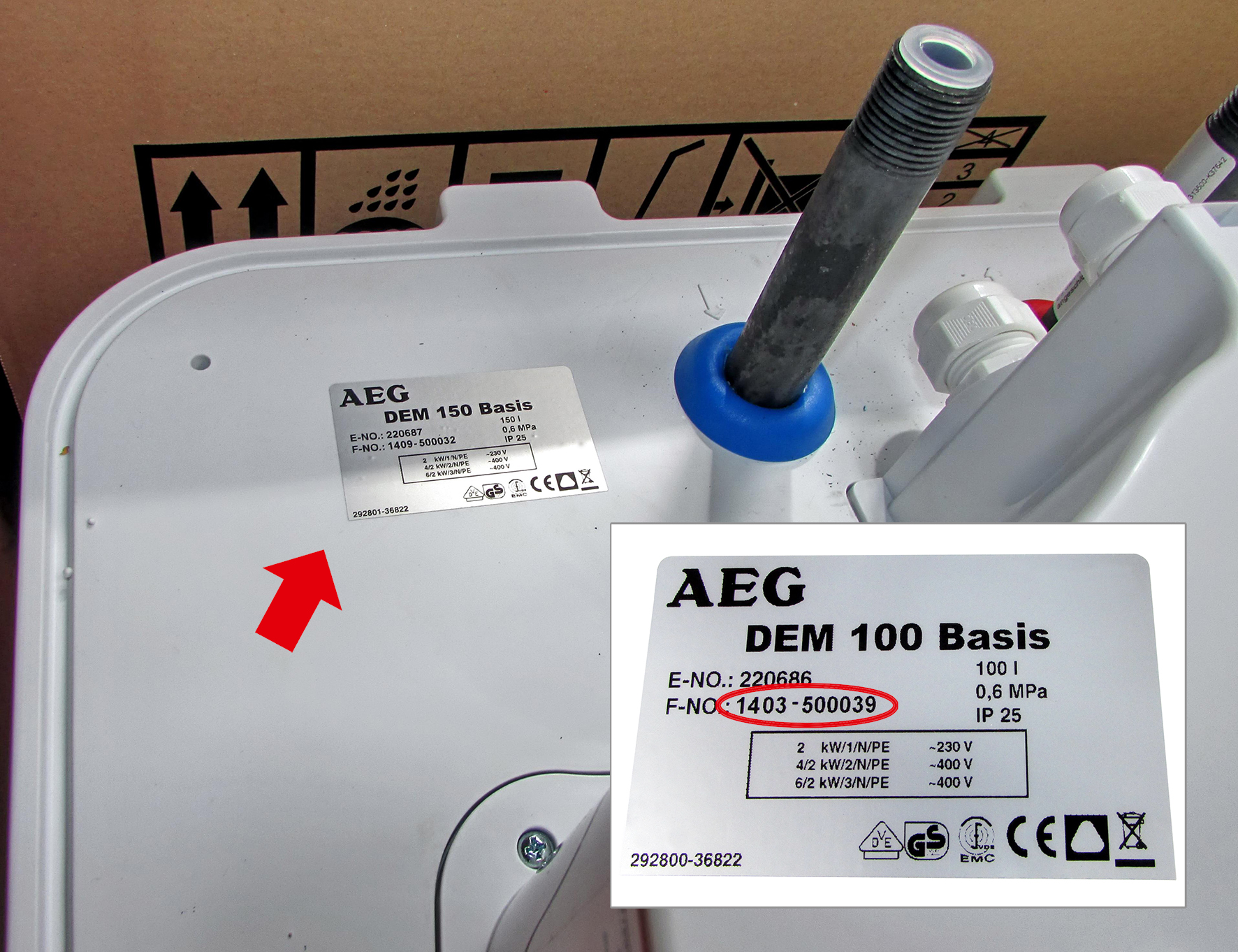 Die betroffenen Geräte können anhand der Angaben auf dem Typenschild (auf der Geräteunterseite neben dem Kaltwassereinlauf) identifiziert werden: