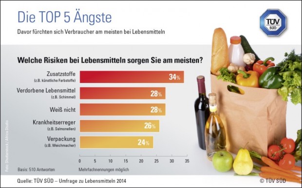In der aktuellen Umfrage des TÜV SÜD gaben 34 % der Befragten an, dass ihnen Zusatzstoffe – z.B. künstliche Farbstoffe – am meisten Sorgen in der eigenen Ernährung bereiten. Danach folgen mit 28 % verdorbene Lebensmittel (z.B. Schimmel) und mit 26 % Krankheitserreger (z.B. Salmonellen). Experten messen zwar dem Verderb von Lebensmitteln durch Schimmel und Krankheitserreger gerade an heißen Sommertagen auch ein hohes Risikopotential für die Gesundheit des Menschen bei. Beim Thema Zusatzstoffe kommen sie im Allgemeinen zu anderen Bewertungen: Sie sehen einen ungesunden Lebensstil mit zu großer Energiezufuhr bzw. wenig Bewegung auf dem ersten Platz der Risikoliste.
