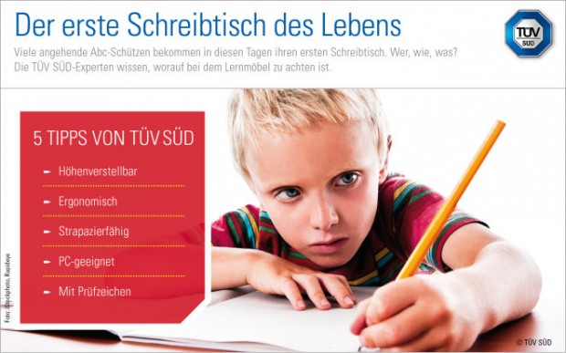 Nach den Sommerferien beginnt für viele Kinder mit der Einschulung eine neue Lebensphase. Zur richtigen Ausstattung der Erstklässler gehört ein wichtiges Möbelstück: der erste Schreibtisch ihres Lebens. Worauf bei der Auswahl und beim Einsatz zu achten ist, dazu gibt es Tipps von den Möbel-Fachleuten von TÜV SÜD.