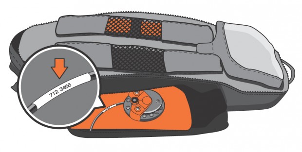 Betroffen sind lediglich die Klettverschlüsse jener ABS-eigenen Vario-Rucksäcke (sog. „ABS Vario Base Units“), die in der Saison 2011/12 produziert wurden und deren Seriennummern mit 612 oder 712 beginnen. Die Seriennummer kann am Kabel neben der Füll- und Ablasseinheit abgelesen werden. Foto: ABS Avalanche Airbag