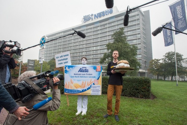 Frankfurt/Main, 1. Oktober 2014. „Ich will keine Werbelüge mehr sein“ – mit diesem Demonstrationsschild steht eine Aktivistin im menschengroßen Alete-Trinkmahlzeit-Kostüm auf der kleinen Wiese vor der Nestlé-Deutschlandzentrale in Frankfurt am Main. „Der Goldene Windbeutel 2014 geht an Nestlé“, heißt es auf einem weiteren Transparent – und auf der Litfaßsäule, die gerade noch eine Reminiszenz an Heinrich Nestlé gezeigt hatte. Aktivisten der Verbraucherorganisation foodwatch haben die Plakate zum 200sten Geburtstag des Firmengründers kurzerhand überkleistert.