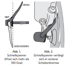 Nach Unternehmensangaben wurden einige Trek Fahrräder verkauft, die mit Scheibenbremsen und vorderem Schnellspanner ausgestattet sind, der sich mehr als 180 Grad öffnen lässt (Abb. 1). Wenn der Schnellspanner an einem Fahrrad mit vorderer Scheibenbremse falsch eingestellt oder offen gelassen wurde, kann sich der Schnellspannhebel in der vorderen Scheibenbremseinheit verfangen (Abb. 2). Wenn dies eintritt, könnte sich das Vorderrad lösen oder abrupt abgebremst werden, wodurch der Fahrer die Kontrolle über das Fahrrad verlieren könnte