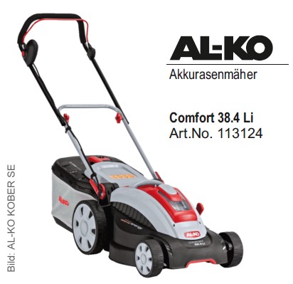Kunden, die einen Rasenmäher der Serie AL-KO Comfort 38.4 Li mit den Artikelnummern 113124 oder 113125 (siehe hierzu obige Abbildung Typenschild am Gerät) gekauft haben, werden gebeten, schnellstmöglich mit AL-KO Kontakt aufzunehmen.