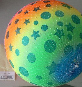 | Beschreibung: | Mit Luft befüllter Ball, Durchmesser ca. 18 cm, aus Kunststoff in Regenbogenfarben und blauen Sternen und Kreisen |