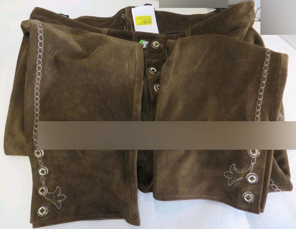 | Beschreibung: | Dunkelbraune Lederhosen mit langen Beinen, Ziernähten und Knopfapplikationen – Probengröße XXL. |