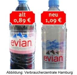 Die Verbraucherzentrale Hamburg hat die Mineralwassermarke Evian von Danone Waters zur Mogelpackung des Monats Juni gekürt. Bislang wurde die 1,5 Liter Flasche für 0,89 Euro angeboten. Nun gibt es das Mineralwasser nur noch in der 1,25 Liter Flasche für 1,09 Euro. Daraus ergibt sich eine satte Preiserhöhung von knapp 50 Prozent (für den Sechserpack sogar um bis zu 53 Prozent), so die Verbraucherschützer.