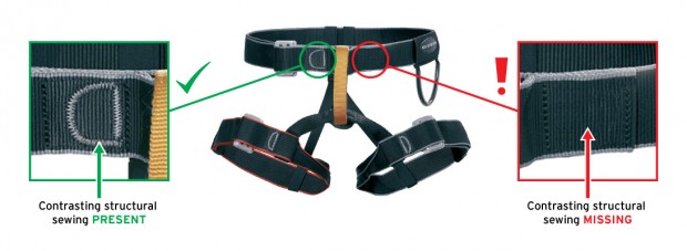Klettergurte an denen die abgebildete Naht fehlt, dürfen auf keinen Fall eingesetzt werden!