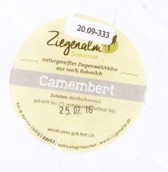 Im Sinne des vorbeugeden Verbraucherschutzes ruft der Hersteller Ziegenalm Sophienhof den Artikel „Camembert, naturgereifter Ziegenweichkäse aus 100 % Rohmilch“ mit dem oben genannten Mindesthaltbarkeitsdatum zurück.