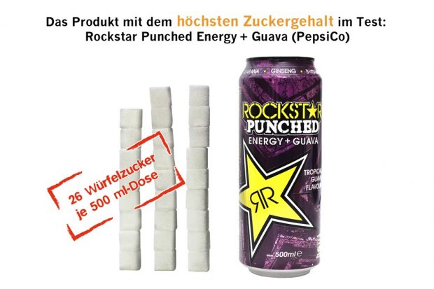 Die süßesten Limonaden sind „tem’s Root Beer“ des Herstellers temetum mit 13,4 Prozent Zucker, gefolgt von „Christinen Lemon“ von Teutoburger Mineralbrunnen und „Mountain Dew“ von PepsiCo. Das zuckrigste Getränk des gesamten Tests ist der Energy Drink „Rockstar Punched Energy + Guava“ (PepsiCo) mit 16 Prozent Zucker – also 78 Gramm bzw. 26 Zuckerwürfeln je 500ml-Dose. Das ist drei Mal so viel, wie die Weltgesundheitsorganisation (WHO) pro Tag empfiehlt – und 50 Prozent mehr als in der gleichen Menge Coca-Cola classic.