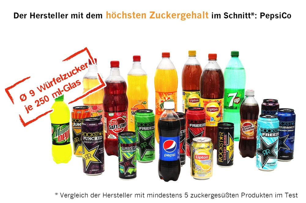 foodwatch hat erstmals den deutschen Markt der sogenannten Erfrischungsgetränke umfassend untersucht und dafür alle entsprechenden Produkte aus dem Sortiment der drei größten Handelsketten unter die Lupe genommen. Getestet wurden Limonaden, Energy Drinks, Saftschorlen, Brausen, Eistees, Near-Water-Getränke und Fruchtsaftgetränke. Im Schnitt enthalten die zuckergesüßten Getränke mehr als sechs Stück Würfelzucker je 250ml. Energy Drinks und Limonaden rangieren ganz oben auf der Liste. Der Hersteller PepsiCo schneidet unter den Branchengrößen am schlechtesten ab: Seine Zuckergetränke enthalten im Schnitt elf Prozent Zucker.