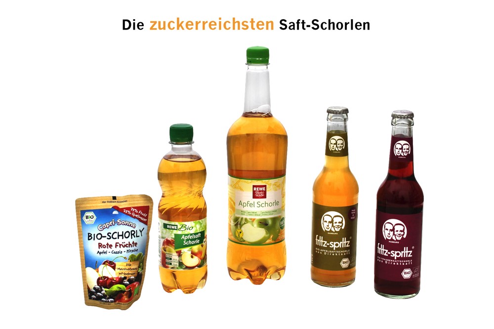 Aber auch Saftschorlen enthalten mehr Zucker als empfohlen, darunter die „fritz – spritz Bio – Traubensaftschorle“ und die „Bio Shorly Rote Früchte“ von Capri Sonne mit jeweils mehr als sieben Prozent. Während die Deutsche Gesellschaft für Ernährung (DGE) empfiehlt, Fruchtsaft und Wasser im Verhältnis 1:3 zu mischen, beträgt das Mischverhältnis bei den meisten getesteten Schorlen 1:1 – was einen höheren Zuckergehalt zur Folge hat. Dass es auch anders geht, zeigt hingegen der Hersteller Bad Liebenwerda mit der „Leichten Schorle Apfel“, in der lediglich 3,3 Prozent Zucker stecken. Auch unter den vermeintlich gesunden Near-Water-Getränken gibt es Licht und Schatten: Während „Apollinaris Lemon“ (Coca-Cola) und Bad Liebenwerda „Spritzig + Citro“ keinen Zucker und auch keine Süßstoffe enthalten, stecken in „Active O2 Lemon“ und „Active O2 Pfirsich Weißer Tee“ mehr als 50 Gramm Zucker in einer 750ml-Flasche.